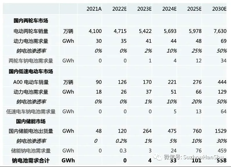考虑国内两轮车市场、低速电动车市场及储能市场,2025年钠电池市场需求为101GWh/年,市场规规超500亿;2030年钠电池市场需求为558GWh/年,市场规模 2785亿。
